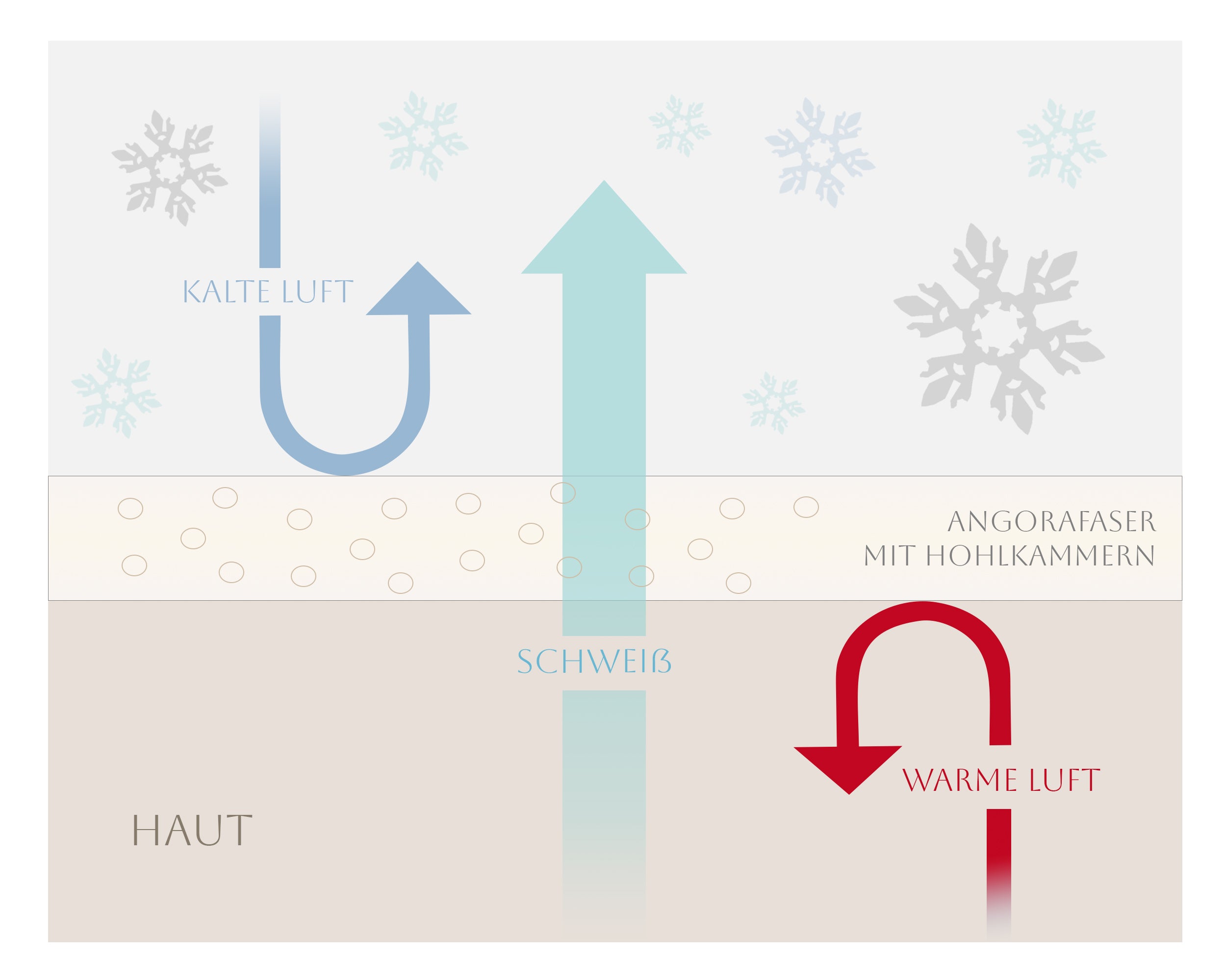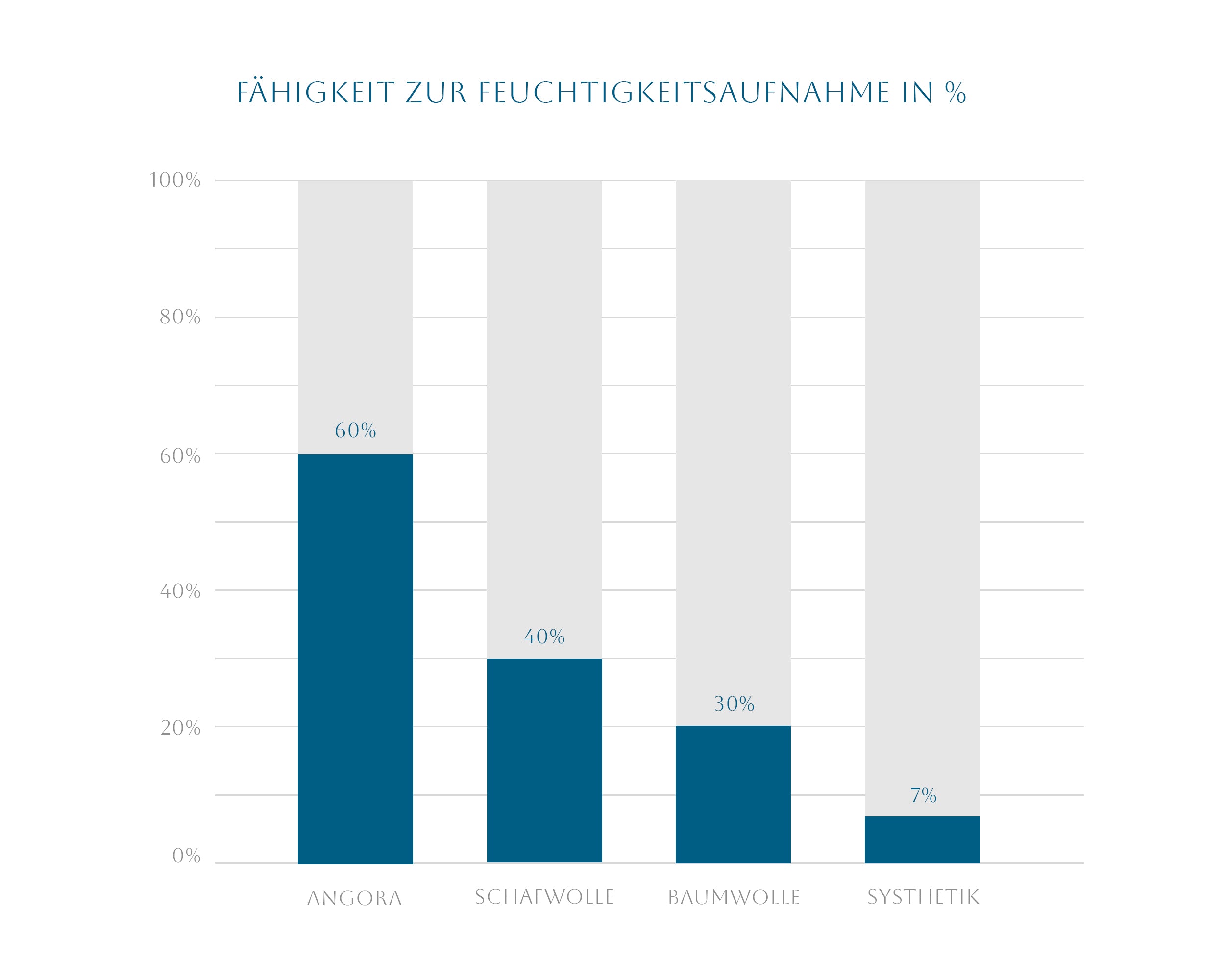 Nos sous-vêtements et segments en angora restent agréablement secs sur la peau, non seulement par temps humide, mais aussi lorsque vous transpirez. Des structures creuses spéciales dans le poil absorbent l'humidité chaude et l'évacuent efficacement. L'angora peut ainsi retenir jusqu'à 60 % de son poids en eau, contre seulement 30 % pour la laine de mouton. Les fibres synthétiques n'absorbent pratiquement pas d'eau. C'est aussi pourquoi la laine de mouton est rapidement mouillée lorsque vous transpirez.